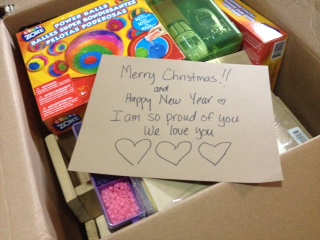 Pictured is a gift and note for the residents of the Nest Domestic Violence Shelter from Georgia Guse, of Guse’s Gourmet Coffee in Longview WA. The note says, “Merry Christmas and Happy New Year. I am so proud of you. We love you.”